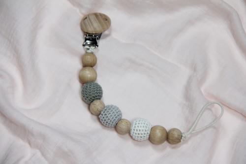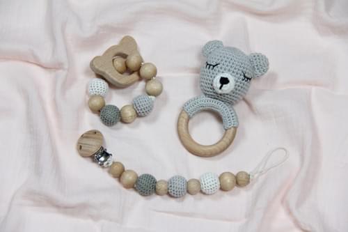 This beautifully designed gift set includes a handcrafted crochet bear wooden rattle, a baby pacifier clip holder, and a wooden teething bracelet. All items are carefully packed in a kraft paper gift box with a transparent window, making it a perfect choice for gifting.