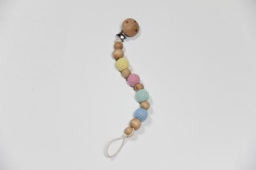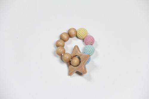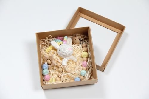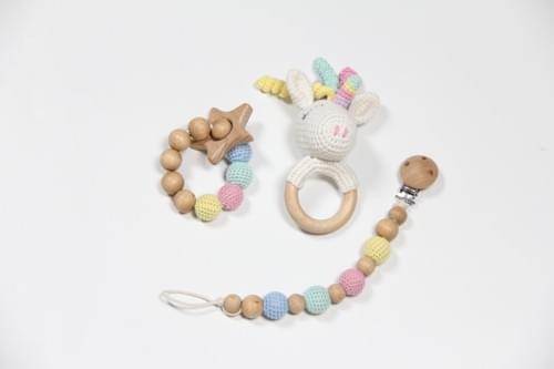 This beautifully crafted gift set includes a Handmade Crocheted Unicorn Wooden Ring Rattle, a Baby Pacifier Clip Holder, and a Wooden Teething Bracelet.
